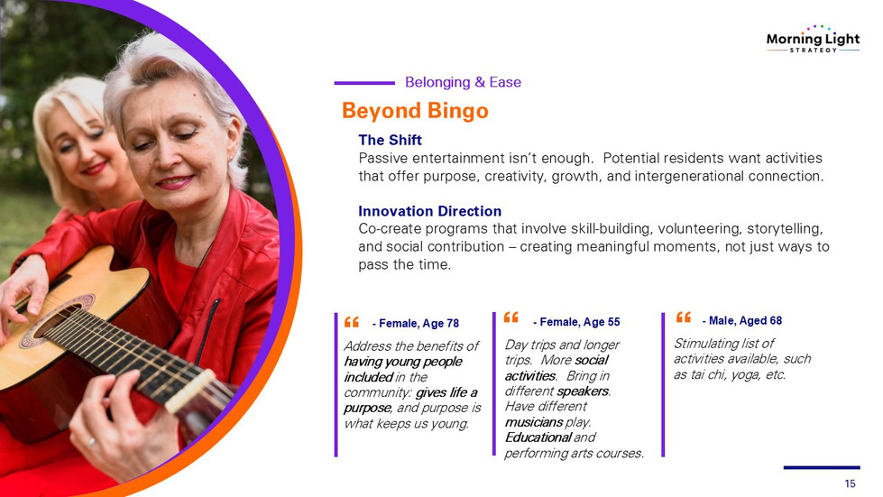 At Morning Light Strategy, we spend a lot of time listening to what older adults actually say they want from the brands, products, and services around them. And in our 2024 study with 500+ potential senior living prospects, some powerful insights emerged from qualitative co-creation exercises like: